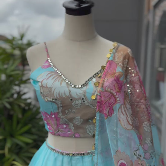 Designer Party Wear Lehenga Choli – Sky Blue Pure Organza | Vastraan